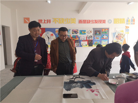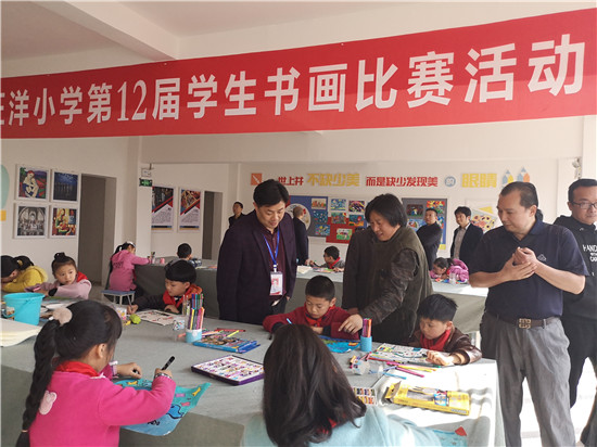 当书画家们来到书画室时,汪洋小学书画比赛已经开始,书画家们非常关心孩子们的书画水平,认真观看,适时指导。