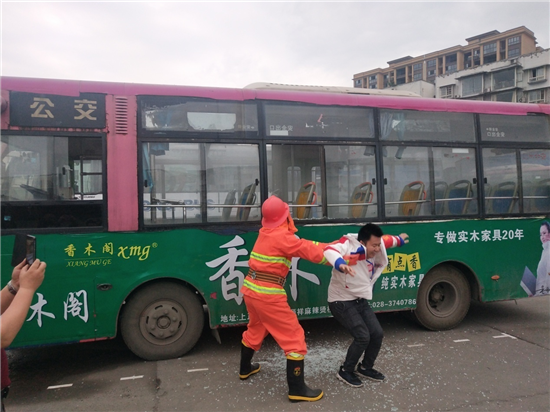 此次演练中,“恐怖分子”携带了易燃易爆物和管制刀具上公交车,挟持了乘客并点燃了汽油。发生恐袭后,应急小组人员按照应急预案部署,立刻赶赴现场并拨打110报警,及时将周围群众和车内乘客疏散至安全地带,配合驻站民警将恐怖分子制服,随即将火势扑灭,对伤员进行急救并拨打120,配合警方和相关部门开展事故的调查取证、分析等工作。