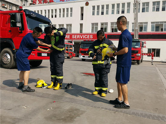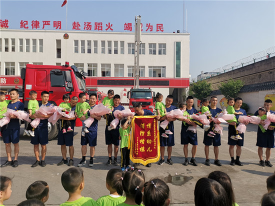 一进入营区,满园春色的营区环境和消防指战员为小朋友们表演的着战斗服、背空呼、两盘水带连接等专业技能令小朋友们惊叹不已。看着消防员穿起消防服帅帅的样子,许多老师都禁不住表示要体验一把,老师在消防指战员的指导下穿上战斗服,戴上安全头盔,真正体验了一把做“消防员”的感觉。同时, 针对幼儿的认知特点,消防指战员循循善诱,形象生动的向孩子们讲解了简单易懂的消防安全常识。小朋友们个个睁着求知的大眼睛,听的全神贯注。不时你一句,我一句,争先恐后的向消防指战员询问消防安全知识。随后孩子们继续对消防营区进行探索,在消防指战员的带领下孩子们参观了指战员宿舍、车库等库室。宿舍内一尘不染的地面、棱角分明的“豆腐块”、整齐划一的内务都引来师生们的交口称赞。最吸引孩子们的还是“豆腐块”被子,孩子们一拥而上一边惊叫一边用小手不停的捏着被子,看着小朋友们这么有兴趣,指战员们也手把手的教了小朋友们叠被子的“绝活”,让孩子们着实过了一把瘾。 车库内,小朋友们参观了消防车及各种消防器材,五花八门的装备器材令他们大开眼界,“七嘴八舌”的问这问那,“这个是什么?”“那个怎么用?”消防指战员们都用通俗易懂的语言来为他们讲解,满足他们的好奇心和求知欲。在离开之际,幼儿园的师生们为表达对消防指战员的热爱和敬佩之情,送上了鲜花及锦旗并为消防指战员表演了一段少儿舞蹈。