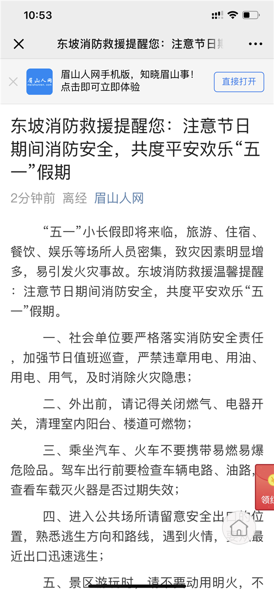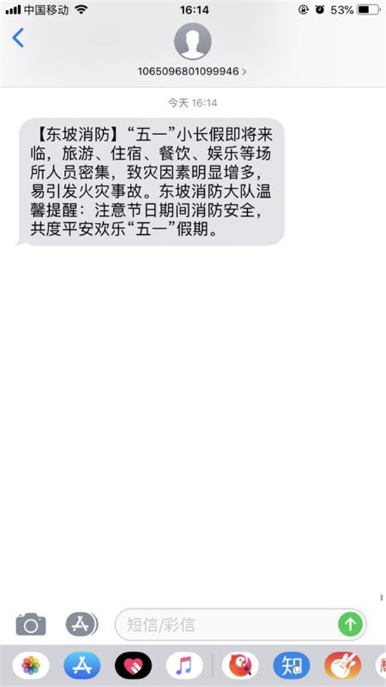 “五一将至,东坡消防提醒您:外出离家时,请关闭煤气和电源;进入公共场所,请注意观察安全出口和疏散通道;遇到火灾及时拨打119”。针对节假日期间火灾多发实际,东坡大队宣传人员充分利用新媒体平台的普及率高和面广的特点,发送微信、微博、短信消防宣传提示语,同时,以各类媒体为依托,提醒群众外出时关门窗、查电源、看煤气。还特别提示每个家庭尽量配备小型灭火器等消防器材,掌握其使用方法,并定期检查,切实提高人民群众的消防安全防范意识。