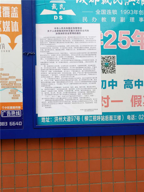 大队宣传人员深入辖区人员密集场所, 将《通告》张贴在醒目位置,时刻提醒群众注意公众聚集场所、人员密集场所火灾危险性、留意场所安全逃生路线、安全出口的具体位置、遇火灾等紧急情况正确逃生、自救方法以及提示注意消防器材放置位置和使用方法等。使过往群众在感受到消防安全宣传的强劲舆论氛围的同时潜移默化地了解相关消防知识,增强消防安全意识。
