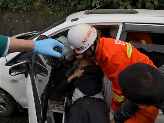 现场情况十分危急。消防员首先从外部将驾驶位的车门拆掉。为防止在破拆过程中造成司机二次伤害,两名消防员钻进车内保护被困人员,安抚其情绪。