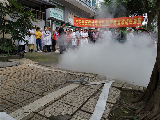 四川新闻网眉山6月1日讯(陈英 文/图) 为增强辖区居民消防安全意识,提高火灾突发时的处置能力,遏制群死群伤火灾事故。5月30日,苏祠街道东安社区携同东方医院开展夏季消防演练活动。社区干部、医院全体职工及周边居民约60余人参加演练。