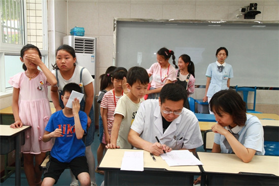 随后,医护人员又为部分学生进行了视力测试,在30余名被随机抽选到参与测试的学生中,发现有10作名学生存在视力低下问题,需要到院做进一步检查。当了解到其中一名学生在外面自行治疗近视时,眼科主任医师指导这名学生说,一旦发生近视,戴眼镜是目前唯一的办法,待孩子成年以后,可以根据自身条件选择手术矫正,所以保护视力,加强防护才最重要。