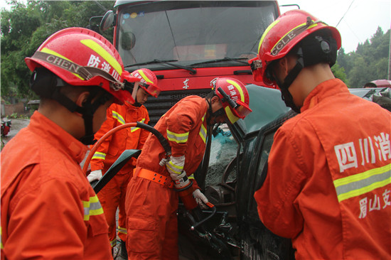 四川新闻网眉山7月11日讯(唐于山 郑丽霞 文/图)7月11日上午8时许,四川省眉山市消防支队书院街中队接到报警称,辖区内宝飞镇发生一起车祸事故,大货车、皮卡货车两车相撞,车祸导致皮卡车司机、副驾驶人员被困,情况危急。