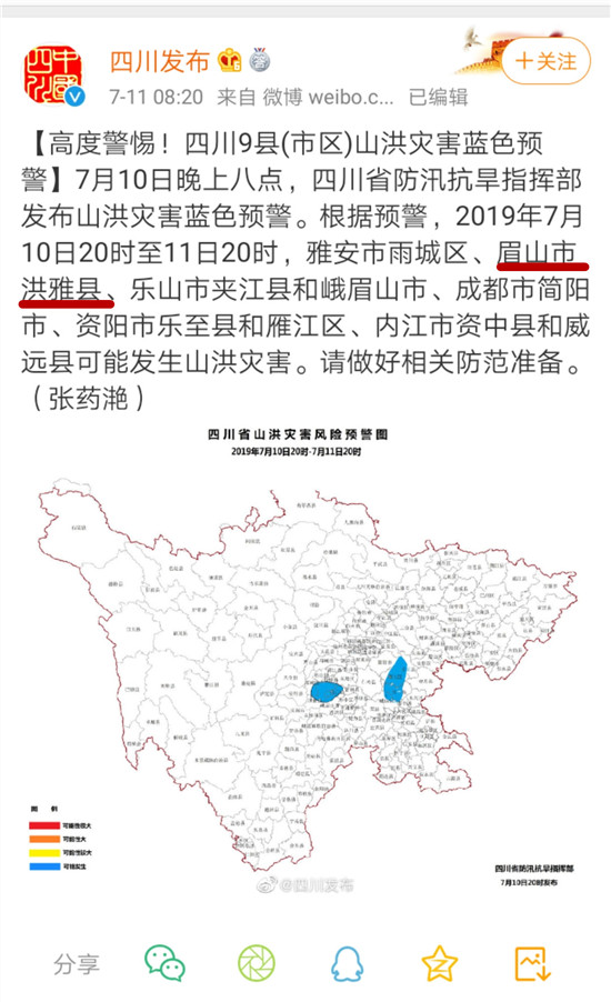 温馨提示:四川省防汛抗旱指挥部于7月10日19时发布山洪蓝色预警,这也是进入主汛期以来,四川发布的首个省级山洪预警。并提醒眉山市洪雅县在内的9个县(市、区)务必做好应对措施,特别是要强化对山区居民点的监测预警,并及时转移安置受威胁群众。