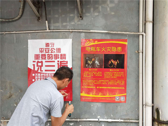 此次张贴的宣传海报创意新颖、寓意深刻,剖析了严禁在楼道内停放电动自行车,严禁违规充电电动车、电动车防火十招等消防知识。期间,大队宣传人员,物业管理单位、消防安全重点单位负责人将宣传海报张贴到社区宣传栏、小区电动车棚等显眼位置,使来往群众潜移默化的关注消防、学习消防,为群众做好电动车消防安全起到了警示教育作用。