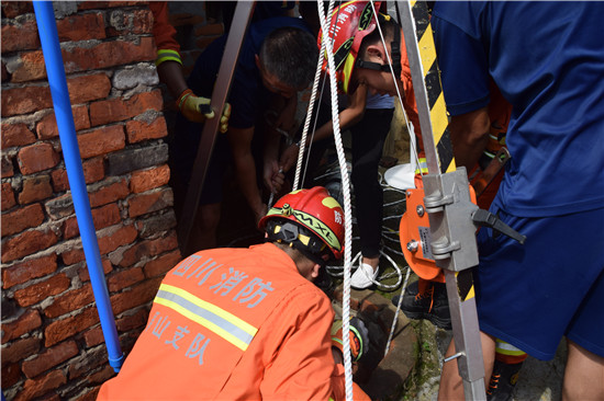 到达现场后,消防员指战员通过对现场的勘察以及对被困人员的询问了解到,井深长达20米且被困人员体力消耗过大而意识模糊,情况紧急救援难度大。消防指战员立即决定使用深井救援,通过三脚架架在井口正上方形成一个稳定的支点,利用三脚架上面的绞盘和钢丝绳将一名消防指战员放下水井,然后给被困老人戴上安全护具拴好安全绳,井水位于老人胸部,消防员担心老人在救援过程中出现身体不适,于是在井里的消防指战员将老人的脚放在自己的肩上,自己浸泡在水中,其他消防员在确保老人安全的情况下协力将钢丝绳往上拉,通过井上井下消防员的努力,于11点08分成功解救被困老人。