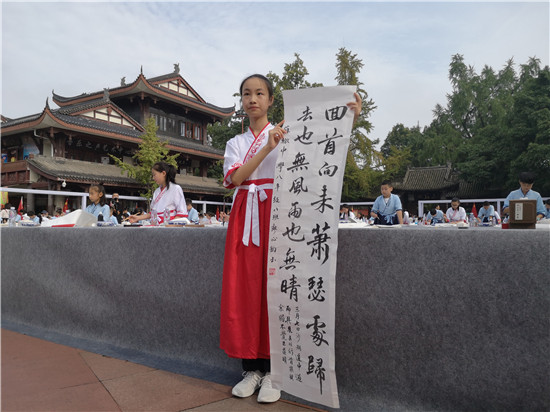 四川新闻网眉山9月12日讯(郑佳洁 文/图)为庆祝中华人民共和国成立70周年,弘扬东坡优秀传统文化,深化“我们的节日”主题活动,9月12日上午,东坡区举行“我们的节日•中秋暨翰墨东坡—百名少年诵东坡庆祖国书法作品展”。