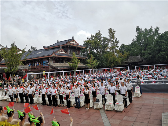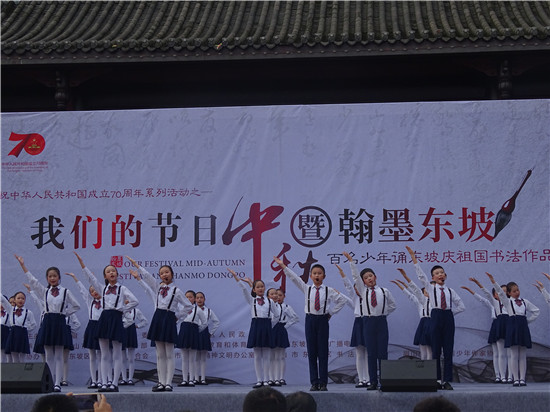 活动现场,一边展示书法,一边表演节目。经典诵读《东坡词韵》、《竹颂东坡》中,激昂的诵读荡气回肠,舞蹈《但愿人长久》美轮美奂,歌舞《我和我的祖国》将活动推向高潮。最后全场挥动小红旗,歌唱祖国,场面宏大。