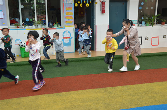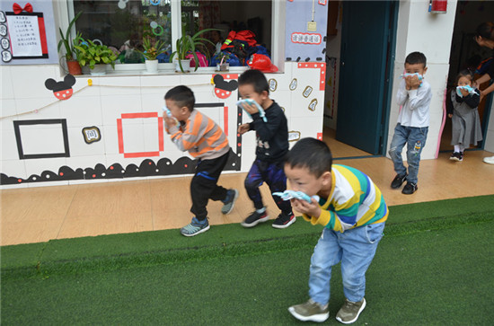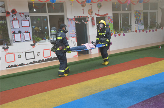 上午十点整,演练正式开始。火情假设幼儿园一教室发生火灾,发现火情后,走廊里“浓烟”滚滚,老师立即拉响警铃,并迅速带领小朋友撤离火场。在演练过程中,各班小朋友在老师的带领下手拿湿毛巾,紧紧地捂住口鼻,弯腰靠墙而走,秩序井然。经过各班老师的清点,全部人员都安全疏散到指定地点,演习顺利完成,达到了预期目的。
