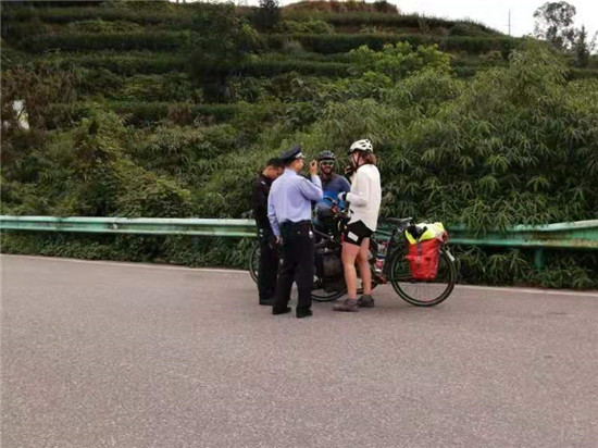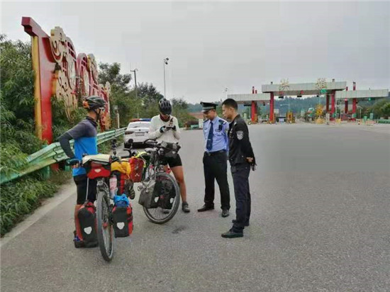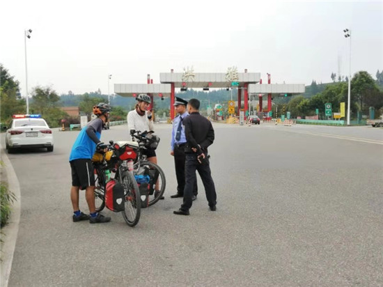 到洪雅南收费站后,民警告诉二人可以沿国道继续骑行,并提醒注意安全、旅途愉快,两名外籍男子对民警和驾驶员表示十分感谢,继续骑行前进。