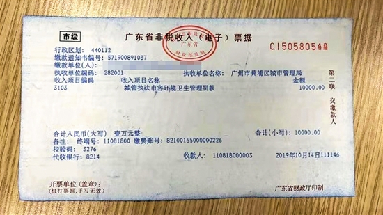 “被处罚的小区已经缴交罚款了。”记者10月16日从广州市黄埔区鱼珠街道获悉,金碧世纪花园物管方在收到处罚通知后,已在10月14日前往银行缴交罚款。记者看到,在一张“广东省非税收入(电子)票据”上,印着金碧世纪花园的物管方名称,以及执收单位的名称。在票据的“收入项目名称”栏,写有“城管执法市容环境卫生管理罚款”“金额10000.00”等文字。在物管缴纳罚款后,广州今年第二宗小区垃圾分类不力导致物管吃“万元罚单”的案例正式“结案”。
