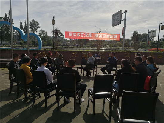四川新闻网眉山10月18日讯(史大琼 郑佳洁 文/图)10月17日,洪雅县政法委党员干部深入展望村与驻村工作组、村两委干部、部分建档立卡贫困户一道在党群服务中心开展“脱贫不忘党恩·致富感谢祖国”座谈会。