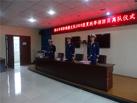 四川新闻网眉山10月28日讯(余欢 文/图)这是一个不舍的离别,这是一段永恒的回忆,来时橄榄绿,走时火焰蓝,依依惜别绿蓝情,满怀豪情踏征程。10月25日,洪雅消防救援大队1名消防员离队仪式在中队会议室举行,副支队冉轶和司令部参谋长王建华到大队同大、中队全体指战员参加欢送仪式。