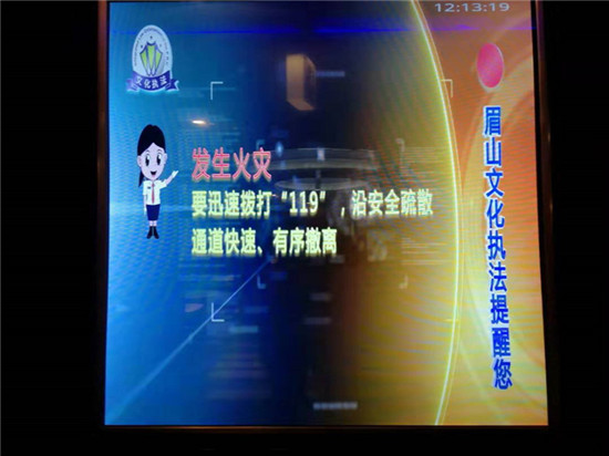 四川新闻网眉山11月5日讯(张意捷 文/图)为进一步推进“119消防宣传月“活动,全面提高广大群众的自防自救意识,11月5日,东坡大队利用辖区娱乐场所将开机前一分钟设置成消防公益广告和消防安全提示,以告知全民遇到火灾等紧急情况如何正确逃生、自救,以更直观易懂易记的方式传播了消防安全“正能量”。