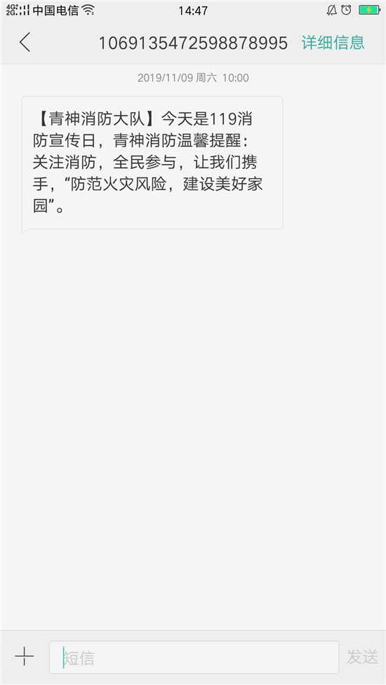 四川新闻网眉山11月11日讯(鲁红燕 文/图)为全面做好“119”消防宣传月期间宣传工作,进一步提高全民消防安全意识。近日,青神大队通过短信平台向辖区手机用户发送消防安全提示短信。