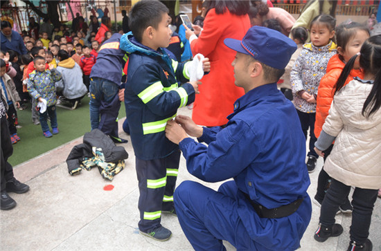 换装变消防。活动过程中,小朋友们在消防员叔叔的帮助下穿上了消防服,变身成小小消防员,让萌娃们学习到消防知识的同时也体验到扮演“小小消防员”的乐趣。