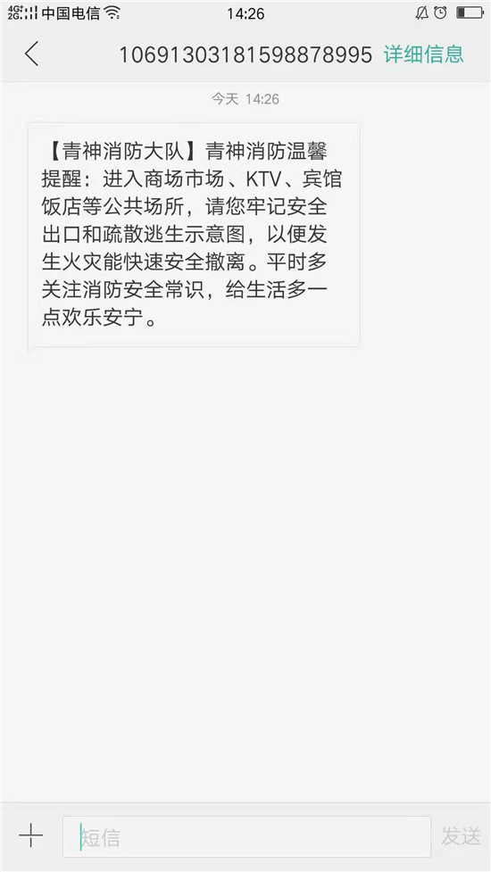 “青神消防温馨提醒:进入商场市场、KTV、宾馆饭店等公共场所,请您牢记安全出口和疏散逃生示意图,以便发生火灾能快速安全撤离。平时多关注消防安全常识,给生活多一点欢乐安宁……”青神大队充分利用短信平台这一载体覆盖面广、言简易记的特点,让一条条温馨提示的短信走进千家万户,使消防安全意识扎根于每位群众的脑海。