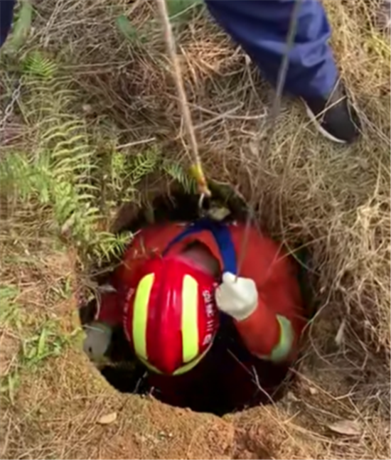 11时29到达现场后,专职消防指战员通过对现场的勘察以及对被困人员的询问了解到,井深长达15于米且被困人员是一名8岁小孩,情况紧急。由于井口狭小救援难度大,消防指战员立即决定使用深井救援,通过三脚架架在井口正上方形成一个稳定的支点,利用三脚架上面的绞盘和钢丝绳将一名消防指战员放下水井,然后给被困小孩戴上安全护具拴好安全绳,其他消防员在确保小孩安全的情况下协力将钢丝绳往上拉,通过井上井下消防员的努力,于11点42分成功解救被困小孩。