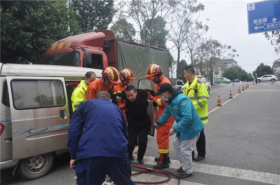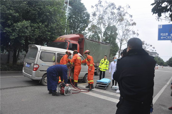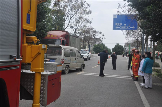 演练开始前,由此次演练负责人详细的介绍了演练的内容,过程以及演练的目的。此次演练的内容是:一辆大货车与面包车相撞,司机被困,无法动弹,需要立即救援。“导演”一声令下,演练开始,交警负责维持现场交通秩序,消防和120接到“报警”后,迅速赶到现场,经过现场查看,车头变形,司机被困,需要立即对车辆进行破拆,现场指挥员下令,立即展开,破拆组利用液压破拆工具组对车身进行破拆,在严重变形的驾驶室内将被困人员救出。