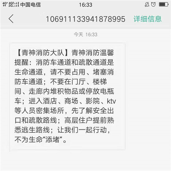 四川新闻网眉山1月16日讯 “青神消防温馨提醒:消防车通道和疏散通道是生命通道,请不要占用、堵塞消防车通道;不要在门厅、楼梯间、走廊内堆积物品或停放电瓶车;进入酒店、商场、影院、ktv等人员密集场所,先了解安全出口和疏散路线;高层住户提前熟悉逃生路线;让我们一起行动,不为生命‘添堵’!”为提高全民消防安全意识,加大对冬春火灾防控宣传力度,切实做好消防车通道专项整治工作,青神县消防大队借助短信群发平台扩大消防宣传面。