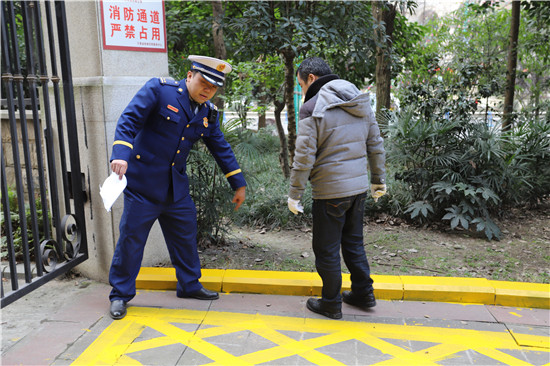 二是深入小区指导划线,全面夯实畅通消防车通道专项工作。大队执法人员深入辖区各住宅小区,查看各小区消防车通道情况,结合本地实际,积极部署,并根据《中华人民共和国消防法》、国家标准《道路交通标志和标线》(GB5768)的规定,制定划线方案,指导小区物业在小区内或单位内划出消防车道、举高车作业面,并贴上了警示标识。同时,提醒居民不能随便占用消防车通道,不能非法占用、堵塞安全出口、楼道,保持消防通道的畅通。