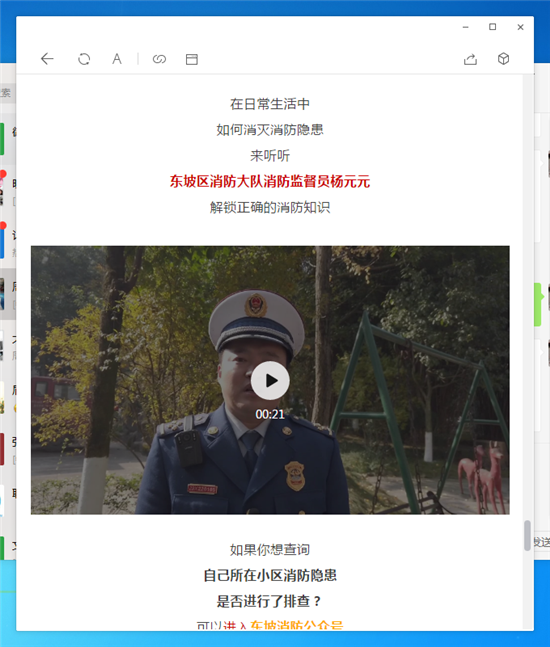 二是依托各类新闻媒体广泛建立宣传阵地。在市级媒体眉山人论坛开设畅通消防车通道专版专栏。该消防专栏定时播报大队消防车通道工作动态和要求,普及消防知识,曝光辖区火灾隐患。同时,通过消防宣传片的形式,把由于人们在日常生活中忽略的占用消防车通道问题而引发火灾,造成威胁家庭及公众安全的案例进行播放,从而引导群众把消防安全作为一项重要工作来抓。