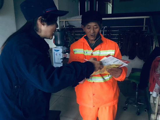 最后宣教人员反复提醒老人:家庭中要注意安全用火、用电、用气,人离开要熄灭火源,出门要关掉电源、气源;阳台上不要储存易燃可燃物,不要用大件家具堵住窗台;不要在走廊、大门口等安全通道处堆放杂物,保证生命通道畅通;出门不要忘记关好门窗、关好电源、关好气源等等。