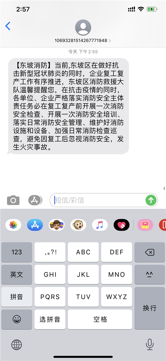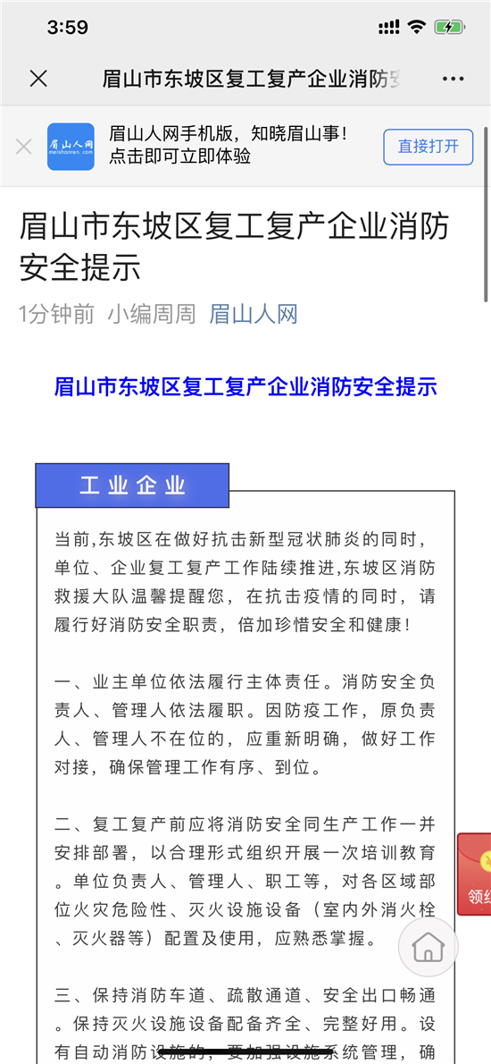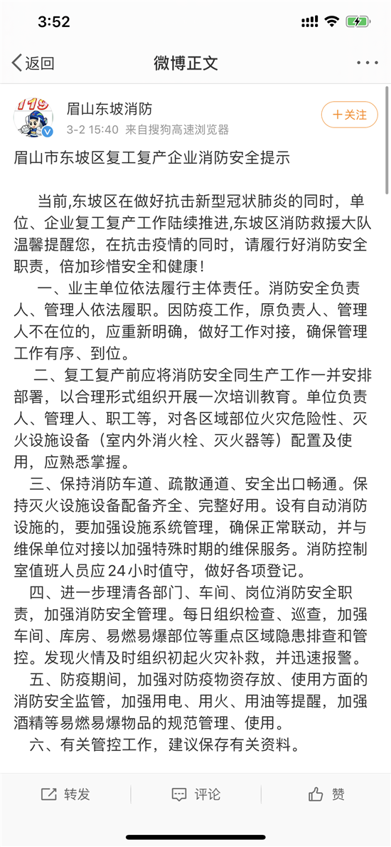 在东坡区各企业复工前,召开安全动员会,明确主要责任人责任,动员各级各岗位人员增强消防安全意识,检查建筑防火及消防设施情况,检查电、气、火安全情况,开展全员消防培训,开展一次灭火和疏散逃生演练切实提高各企业消防安全意识。