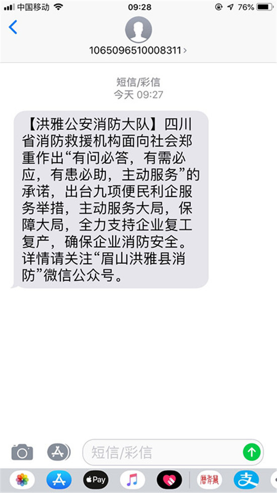 洪雅县消防救援大队利用短信宣传这一迅速、便捷的方式通过短信平台,将省消防救援总队“有问必答,有需必应,有患必助,主动服务”的“十六字”服务承诺的信息发送至每一位手机用户,并提示广大群众关注“眉山洪雅县消防”微信公众号,了解“十六字”承诺详细活动内容。