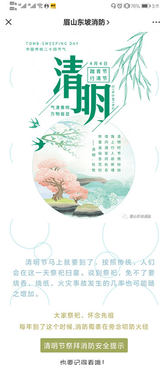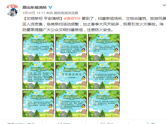 清明节将至,祭扫高峰将要来临,东坡消防救援大队及时通过公众平台提醒广大市民祭扫时应当注意的诸多事项,同时通过微信、微博、眉山人网等公众平台更方便开展消防安全知识大传递活动,不仅调动了广大人民群众的积极性,实现了消防宣传与千家万户的互动,也让更多的群众知消防、学消防、懂消防,从而形成“人人关注消防、人人参与消防、人人学习消防”的良好社会环境。