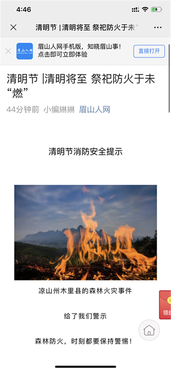 通过此次消防安全提示,充分发挥公众平台的大作用,增强群众自我保护意识,从而逐步建立起“人人学消防,人人懂消防”的良好消防工作局面,全面提高了全区火灾防控能力,为“清明节”期间的消防安全奠定了坚实的基础。(东坡区消防救援大队供稿)
