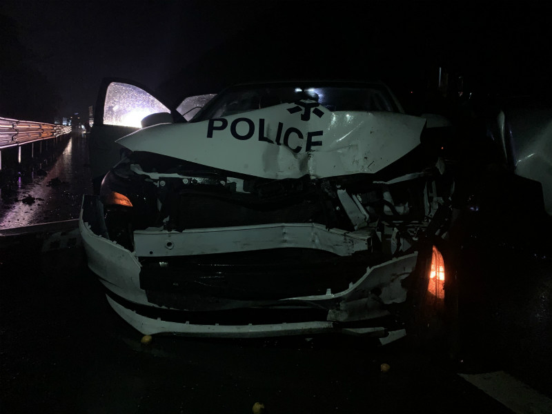 4日凌晨3时许,行驶至厦蓉高速泸州市纳溪区路段时,弯道上一辆面包车侧翻在高速路中,后面紧跟的一辆轿车突然紧急制动,阙尧驾驶警车迅速反应,避让停车,但行驶在警车后面的一辆大货车刹车不及撞向警车,造成四车追尾的交通事故,致警车后备箱全部撞毁、右后门几乎被撞飞,警车上的阙尧、代郑波、朱能均不同程度受伤。