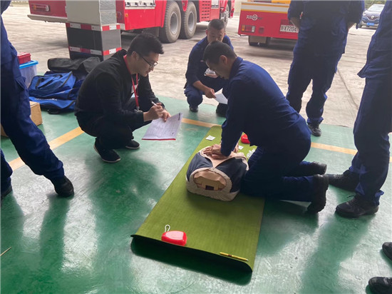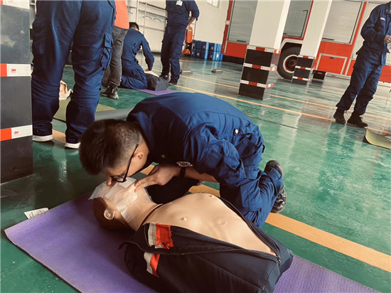 “遇到紧急的突发状况,如何进行科学自救和施救,避免因救护不当引起再损伤……”培训中,急救中心专家结合多年救护经验,用通俗易懂的语言为全体消防员现场讲解和生动演示了各类突发意外伤害现场的基本救护方法。同时,对止血、包扎、骨折固定、心肺复苏、人工呼吸等急救知识与技能进行了现场演示。为了使大家更好地掌握心肺复苏的技术要点和正确操作手法,急救中心专家利用人体模型组织队员进行操作演练,手把手教学,面对面授课,让大家收获了丰富的急救知识技能。