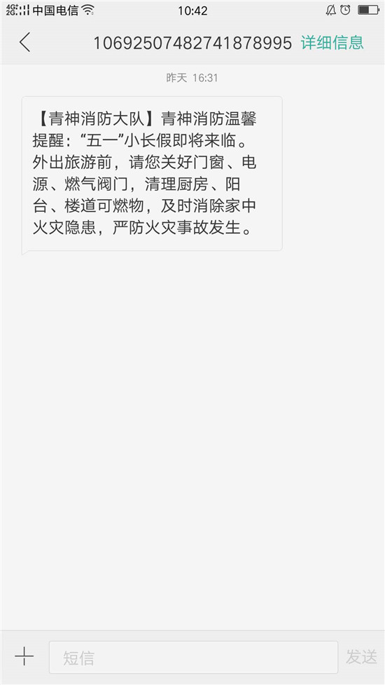 “青神消防温馨提醒:‘五一’小长假即将来临。外出旅游前,请您关好门窗、电源、燃气阀门,清理厨房、阳台、楼道可燃物,及时消除家中火灾隐患,严防火灾事故发生……”短信内容紧紧围绕“五一”期间外出旅游时注意事项,及时提醒群众在离开家中切断电源、旅游外出等要注意防火、用火安全。