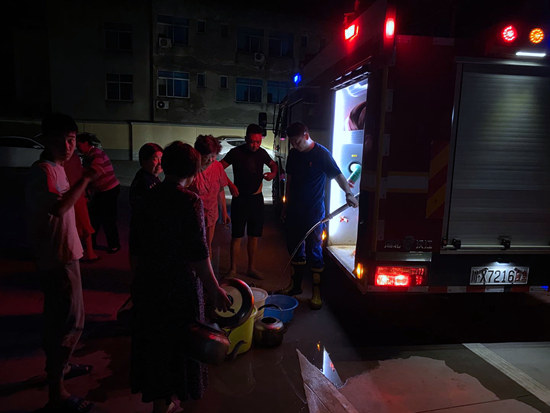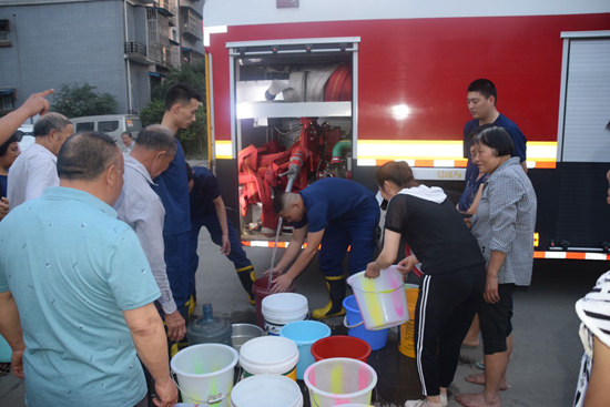 在送水任务中,眉山市消防救援支队的指战员们共为群众送水15余吨,解决了13个居民小区1100余户群众的生活用水难问题。