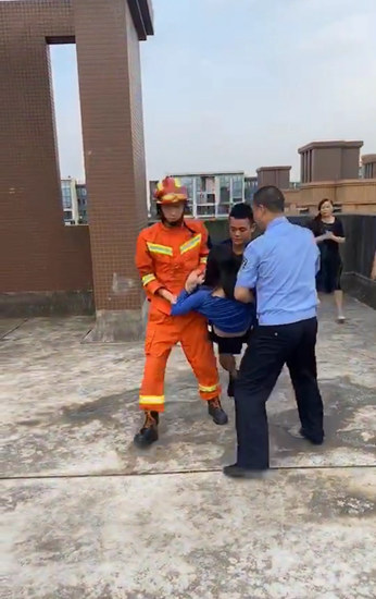 四川新闻网眉山5月5日讯(唐英 郑丽霞 文/图)5月4日下午17时许,眉山市仁寿县消防救援大队接到报警,称一小区内有人欲跳楼轻生,仁寿县消防救援大队立即派出1台消防车7名指战员赶赴现场。
