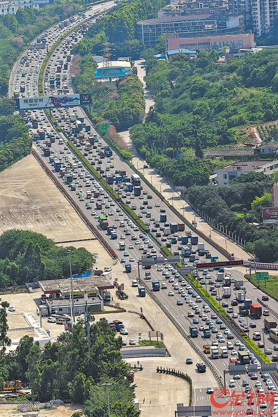从沙贝立交往南至东沙立交一带,记者看到,此处也出现了不同程度的拥堵;在广州南环高速三滘立交一带由东往西方向路段,车流量也明显增多,车辆只能缓慢通行;在华南快速路段,虽未出现拥堵现象,但双向车流量均已饱和。