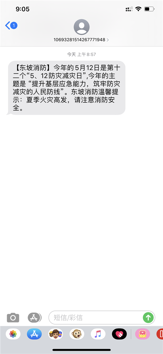 四川新闻网眉山5月12日讯(周涛 杨八仙 文/图) 今年5月12日是我国第十二个“防灾减灾日”,为进一步扩大防灾减灾工作的宣传面和覆盖面,时刻提醒市民注意识别灾害风险,掌握减灾技能,使大家在耳濡目染中提高防灾减灾意识。东坡消防救援大队在5月12日当天发布短信,提醒群众注意消防安全。“今年的5月12日是第十二个“5·12防灾减灾日”,今年的主题是 “提升基层应急能力,筑牢防灾减灾的人民防线”。东坡消防救援大队温馨提示:夏季火灾高发,注意消防安全。”