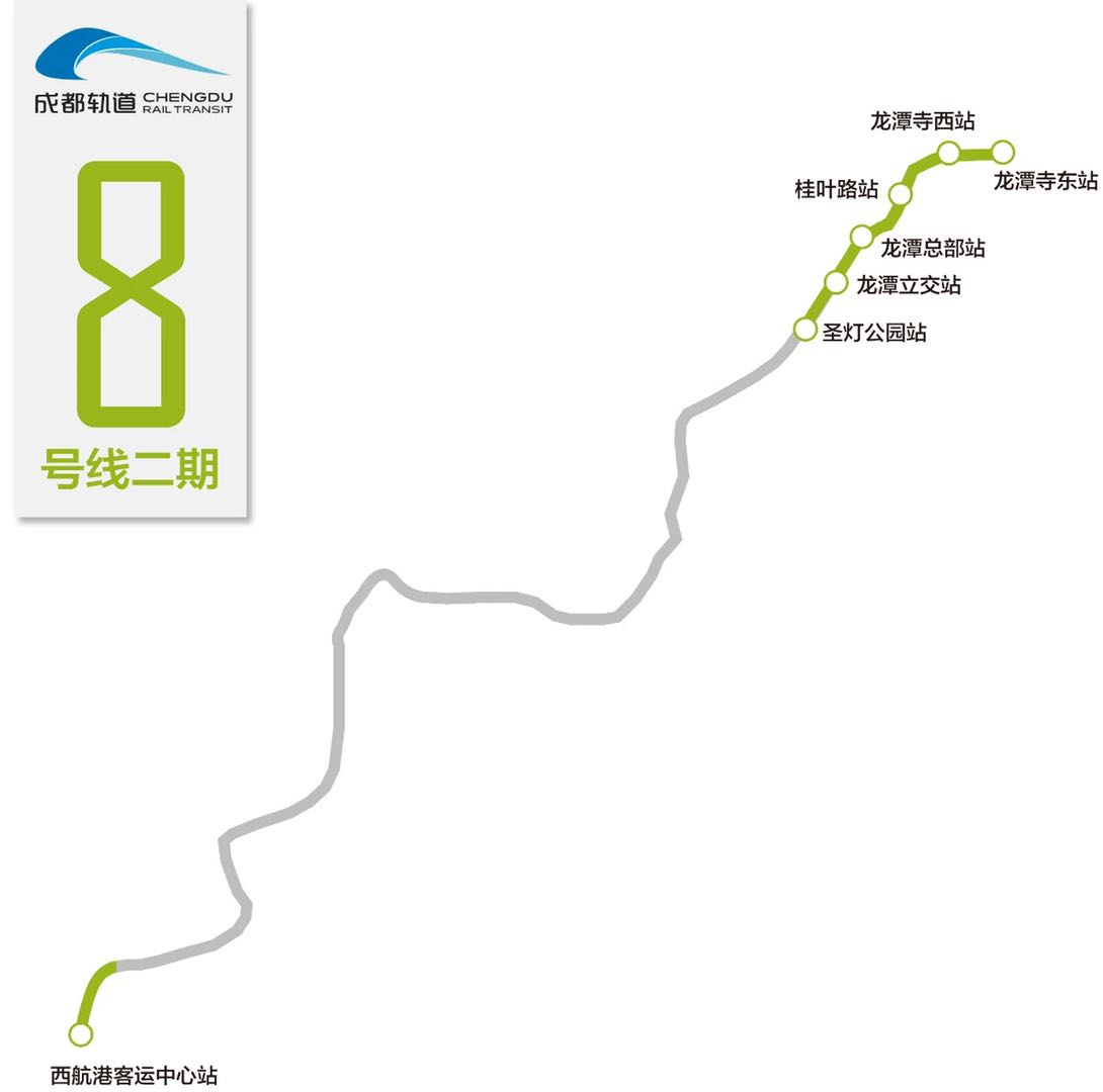 成都轨道交通8号线总体呈西南~东北走向,8号线二期工程作为一期工程的延伸线,共分两段线路;其中西南延伸段(西航港客运中心站~莲花站<不含>,沿西航港大道敷设)共设1站1区间,线路长1.25km;东北延伸段(十里店站<不含>~龙潭寺东站,沿成华大道~规划路敷设)共设6站6区间,线路长6.56km。8号线二期工程线路全长7.81km,均为地下线,共设置车站7座,其中换乘站3座,平均站间距为1.12km,最高运行速度80km/h。设龙潭寺停车场1座,龙潭寺主变电所1座;控制中心共享崔家店控制中心。工程建成后将加强城市周边区域与中心城区联系,支持龙潭总部经济城的建设,构建轨道交通网络、衔接客运交通枢纽,进一步完善轨道交通8号线功能。