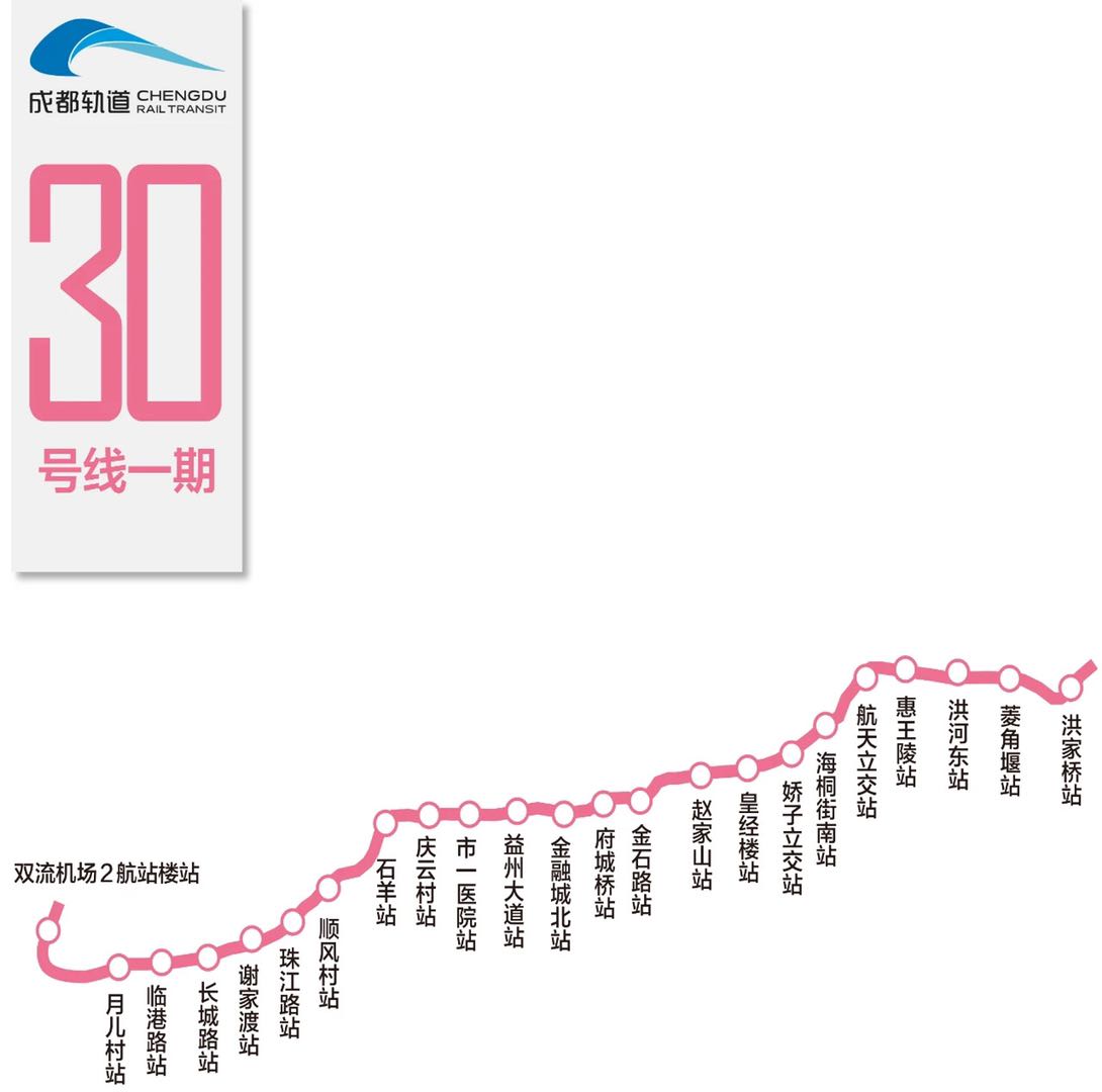 成都轨道交通30号线一期工程起于双流机场2航站楼站,止于洪家桥站,呈西南向东北沿大件路、石桥路、府城大道、桦彩路、三环路南段、陵川路、洪景南路、东部新城规划道路敷设。一期工程线路长约26.284km,均为地下线,共设置车站23座,其中换乘站14座,平均站间距1.17km,最高运行速度80km/h。设高碑坝车辆基地1座,洪家桥停车场1座;设高碑坝主变电所和洪家桥主变电所2座;控制中心共享线网新苗控制中心。工程建成后将加强成都东西向的交通联系,引导城市向东发展,为“东进”战略提供支撑,进一步完善成都市轨道交通网络。