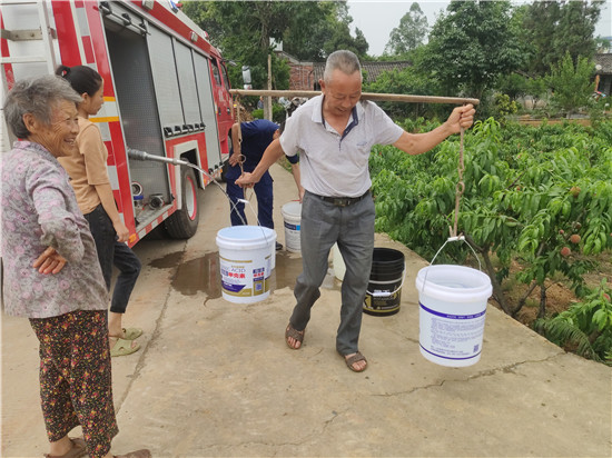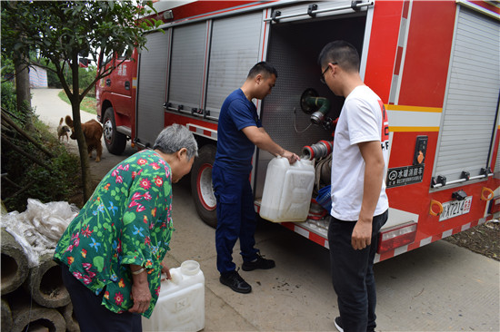 四川新闻网眉山5月25日讯(周涛 文/图)5月22日,东坡消防救援大队万胜专职队接到辖区的群众求助称:万胜镇天乐村因多日干旱导致日常供水不足,请消防救援大队送一些自来水供应。