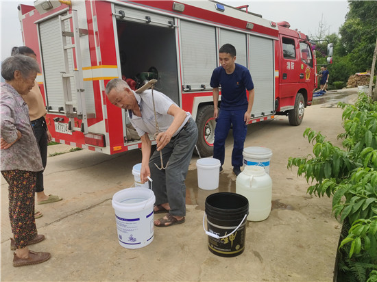 在得知这一情况后,万胜专职队为了让缺水群众喝上干净水、放心水,首先对消防车水箱、水枪等供水器材仔细清洗,确保供水卫生、清洁。一切准备工作完成后,送水队员前往送水地点为供水不足的村民送水8车约24吨,为民众解燃眉之急。