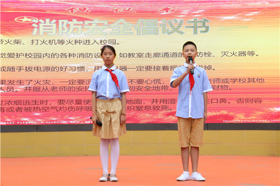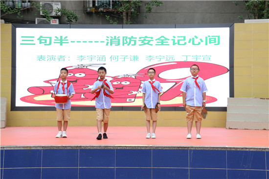加强消防意识,遵守消防规则。活动中,组织师生学习消防常用知识,学习消防灭火器的实用,掌握如何正确灭火等多种消防知识。 李宇涵、李宁远、何子谦、丁宇宣四位同学带来的三句半表演,用诙谐幽默的语言精辟地总结了消防常识,让同学们在欢声笑语中增强了消防意识。黄缌彤和胡浩扬同学向全体同学发出了消防安全倡议。