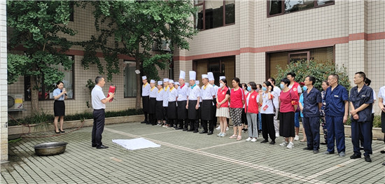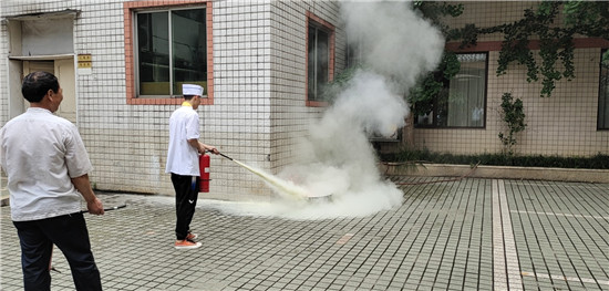 此次演练分为安全培训和消防演练两部分。眉山宾馆负责人首先对参会人员进行了消防安全知识培训,对灭火器、灭火毯的使用方法进行了讲解。消防演练在眉山宾馆静居楼外进行,要求到场人员逐一动手利用灭火器和灭火毯对油锅进行灭火。