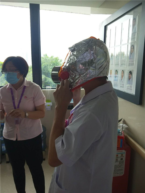 演练模拟了一个场景,住院部二楼护士查房时发现病人违规用电,引起火灾。护士马上大声呼喊,让其他当班护士知道发生火情,两位男医生马上对初起火灾进行扑救,护士长指挥当班护士协助现场病人疏散至一楼停车场处,并通知保安队长前来救火。火势加大,已无法扑救的模拟场景出现,护士长报119,等待消防指战员开展救援。