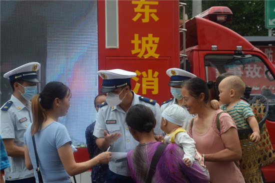 四川新闻网眉山6月17日讯(徐磊 郑玉珍 文/图)为全面做好辖区夏季火灾防控工作,进一步加强安全生产月宣传工作,普及消防安全知识,切实提高辖区居民消防安全意识,营造良好的辖区消防安全氛围,6月17日上午,正值赶集之际东坡消防白马专职队深入热闹街区,在东坡区多悦镇建设街开展消防宣传。