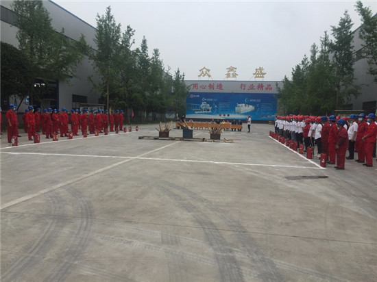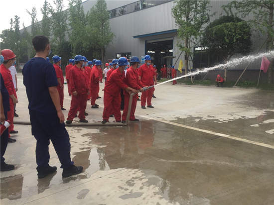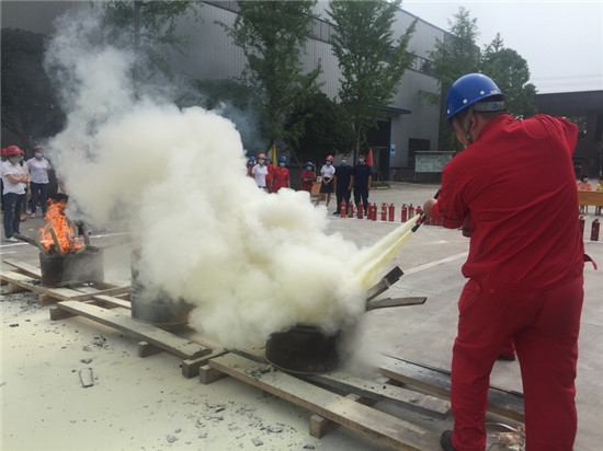 “大家一定要记住,使用灭火器时要牢记几个要点:一提二拔三对准四喷。灭火时要站在上风口方向,一手将喷头对准火源根部,一手握住压把喷射药粉灭火。当火势过大时,要立即进行疏散,并拨打119报警电话。疏散逃生时,一定不要慌张,要保持冷静,用湿毛巾或者打湿衣服,弯腰匍匐逃出火场……”为了更好的让理论知识与实际操作相结合,在开始演练前,大队培训员向全体参训员进行理论知识要点讲解。随后,模拟某生产车间发生火灾事故,所有参训人员按照预先拟定的应急疏散方案,在现场指挥员的指导下,一个个手拿毛巾,弯腰捂鼻,快速撤离火灾现场。待所有人员集中到指定集中地点后,大队培训人员组织全体参训员工进行水带连接消火栓出水和灭火器扑灭油盆火实战演练。