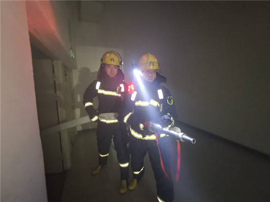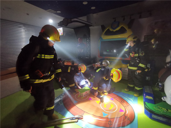 洪雅大队接到报警后,立即组织救援力量赶赴现场。到场后,发现现场浓烟滚滚,“火势”已蔓延至其他楼层,经询问现场经理得知有人员被困。现场指挥员将救援力量分为火情侦察组、搜救组、破拆小组和灭火组。要求侦察小组查明起火点、燃烧物质和火势蔓延方向;灭火攻坚组深入内部利用固定灭火设施及消防车出水阻止火势蔓延,掩护人员疏散;搜救小组和破拆小组深入商场内,在灭火攻坚组的掩护下搜寻被困人员,并组织人员有序疏散。外围的参战指战员则启用高喷车及车载水炮进行围攻。在灭火攻坚组的掩护下,搜救组成功将2名被困人员全部救出,并移交给医护人员进行救治。